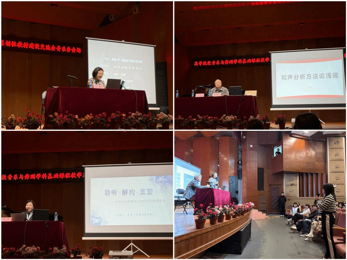 杨通八、刘诚教授对《高等教育音乐大众化趋势下的作曲理论教学及和声分析方法论浅说》、左佳教授《聆听·解构·重塑——对基本乐理课程与教材建设的再思考》中对和声教学与教材内容实用性、基本乐理教材中的理念更新进行讲解与解答。