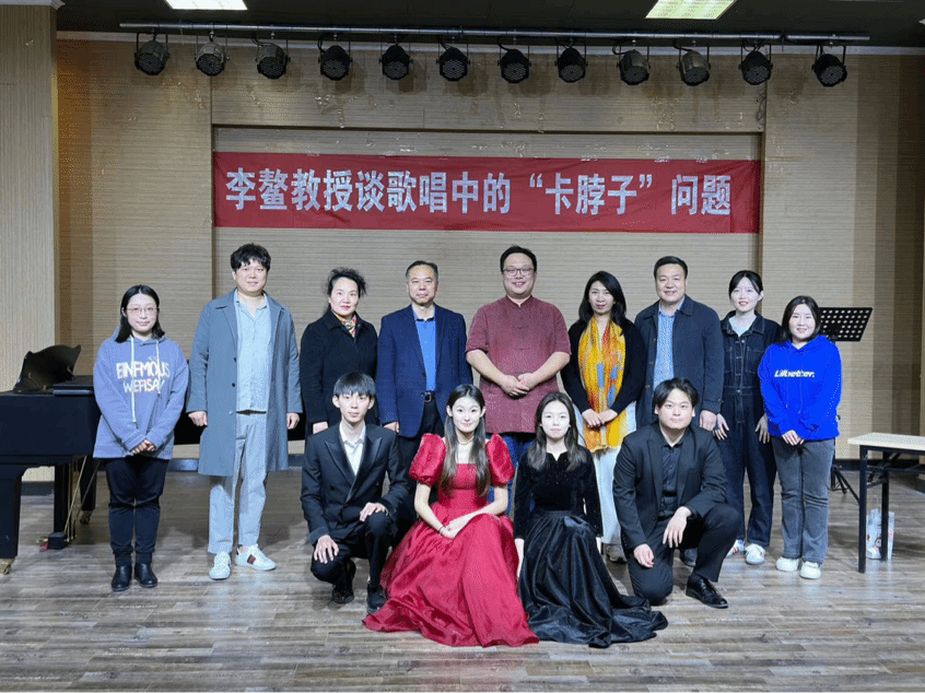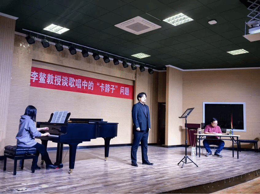 李鳌老师以幽默风趣、循循善诱的方式开讲,他首先阐明了什么是歌唱中的“卡脖子”问题,继而从发声理念、歌唱技术、作品风格、发音吐字、审美认知、歌词意境、舞台实践等方面逐一答疑释惑,为全体与会者生动讲解了演唱技术、声乐学习方法及歌唱的审美问题。