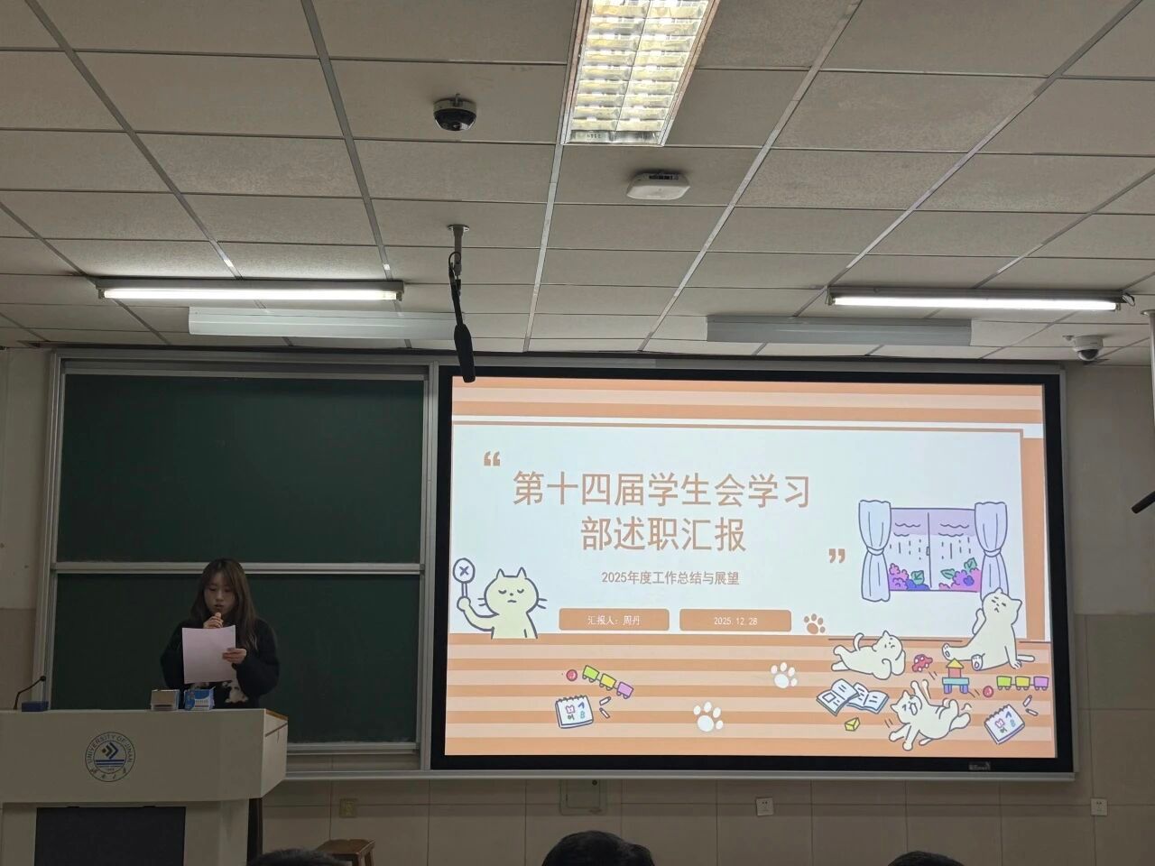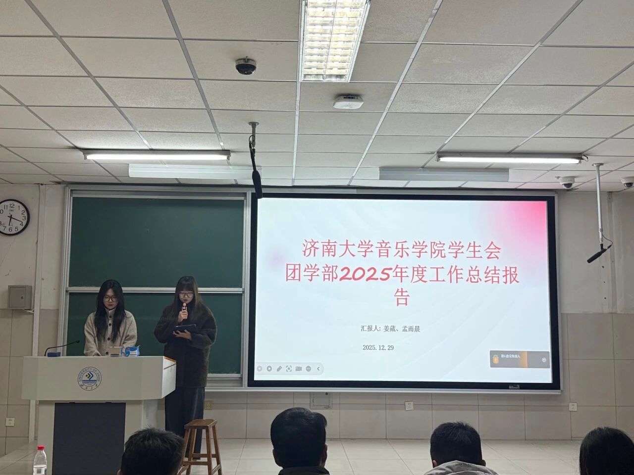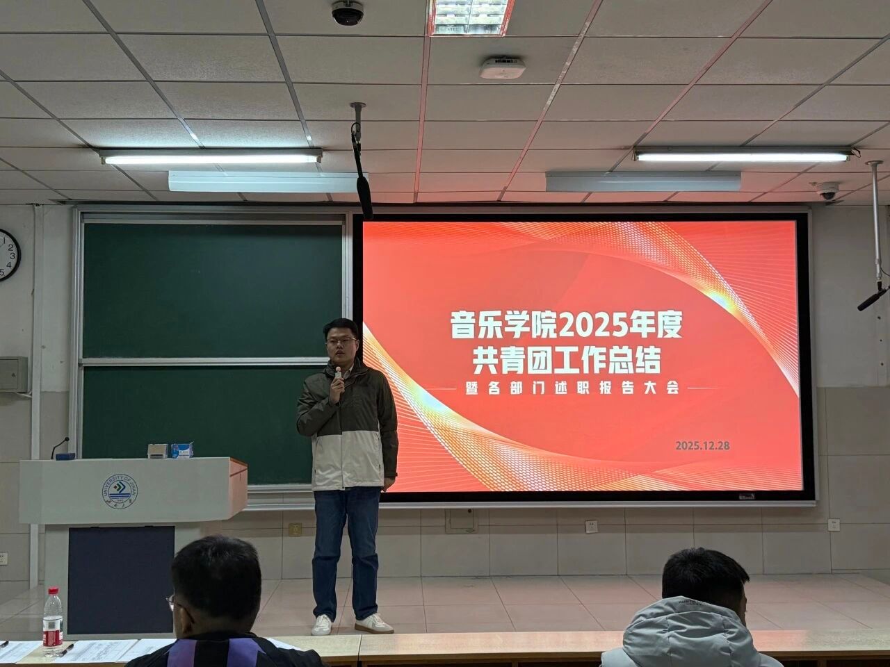 于2025年12月28日组织召开2025年度共青团工作总结暨学生会各部门述职大会。学院学办主任兼团委书记王栋、共青团指导教师侯梓腾、2025级本科生辅导员李肖璇出席会议,91视频