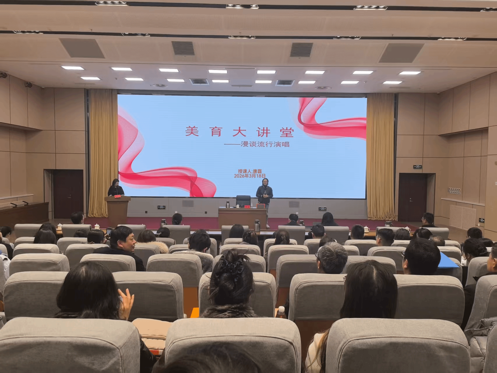 现代音乐系主任、经典民谣《丁香花》原唱、知名创作歌手唐磊受邀开讲。省教育厅部分干部职工参加活动。