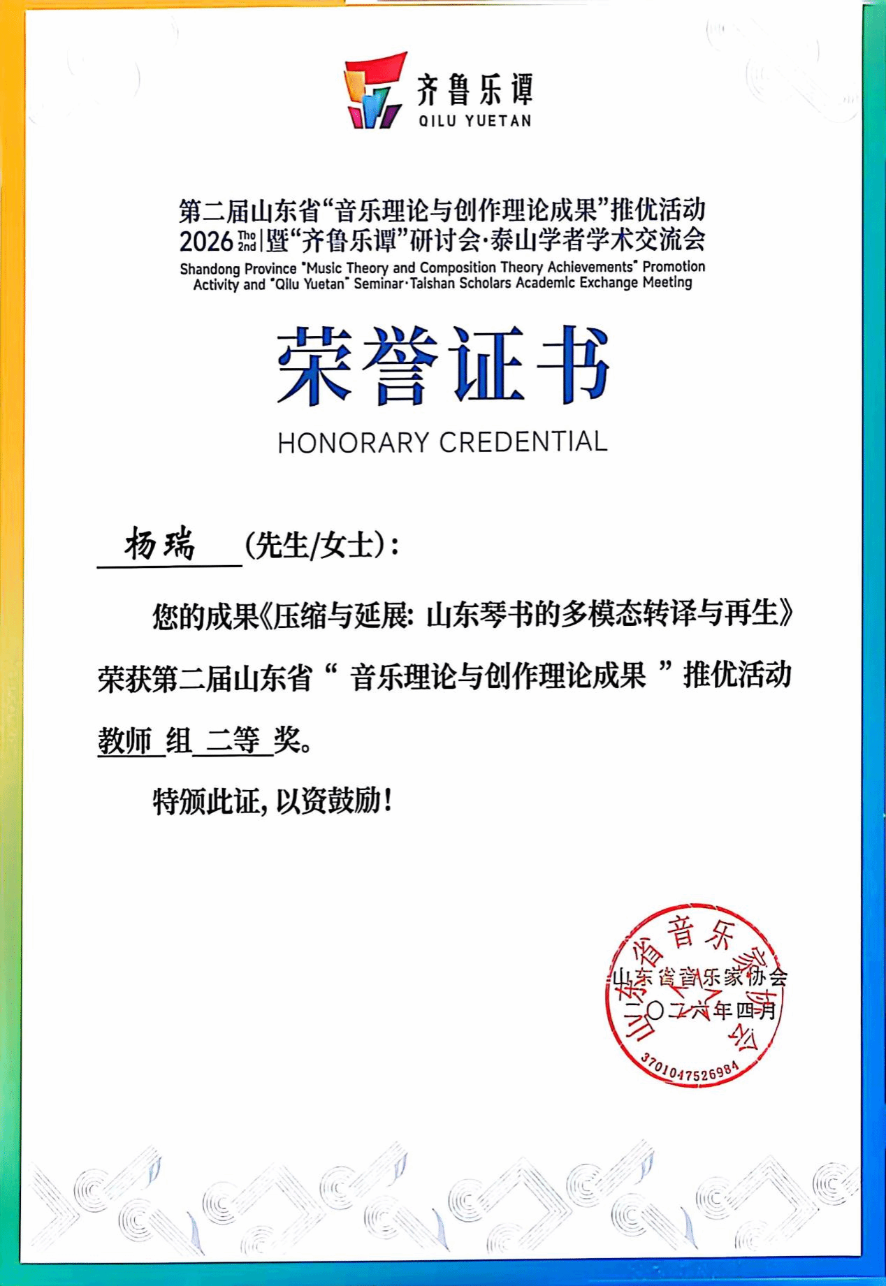 杨瑞教授的《压缩与延展:山东琴书的多模态转译与再生》获教师著作类二等奖;范洪涛老师的《〈朝鲜王朝实录〉所载世宗朝文庙释奠乐音乐形态研究》获教师著作类三等奖;王晓锋老师的《坠韵·弦吟》获教师组作品类三等奖;李季雨老师的《诗经·郑风·子衿》获教师组作品类优秀奖;音理2401班曹梦冉的《“新史学”疏义及对音乐学界之影响研究》获学生著作类二等奖(指导老师 范洪涛);音理2301班孟书涵的《“狩猎”的音画转译——浪漫主义钢琴小品中的意象塑造与风格诠释》获学生著作类三等奖(指导老师 左丹婷)。