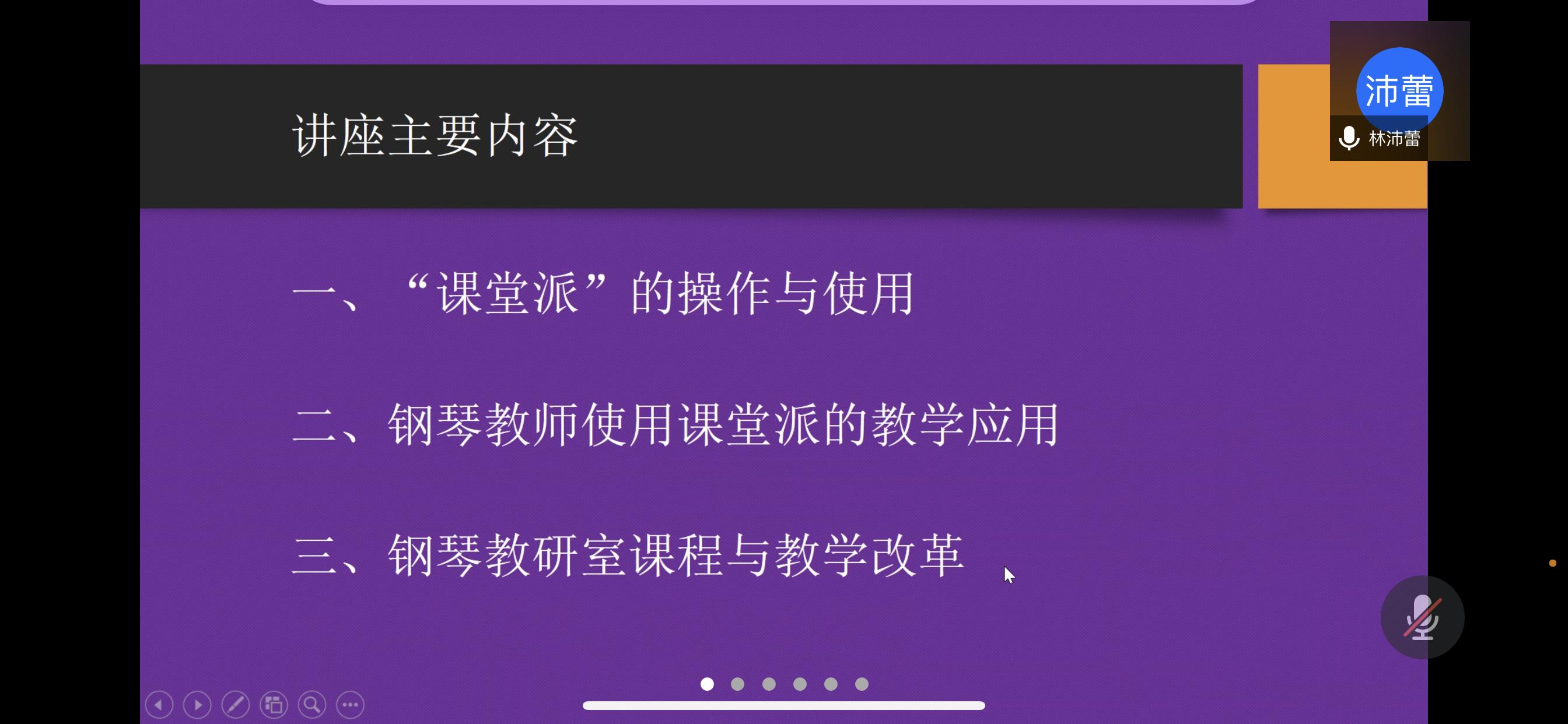 优秀线上教学案例。4月19日,钢琴教研室主任林沛蕾博士为全体教师作题为《走进时代云端,共筑一流金课——“线上线下混合式教学”课程建设经验分享会》,分享会采取线上形式举行,由院长助理齐丽花老师主持。