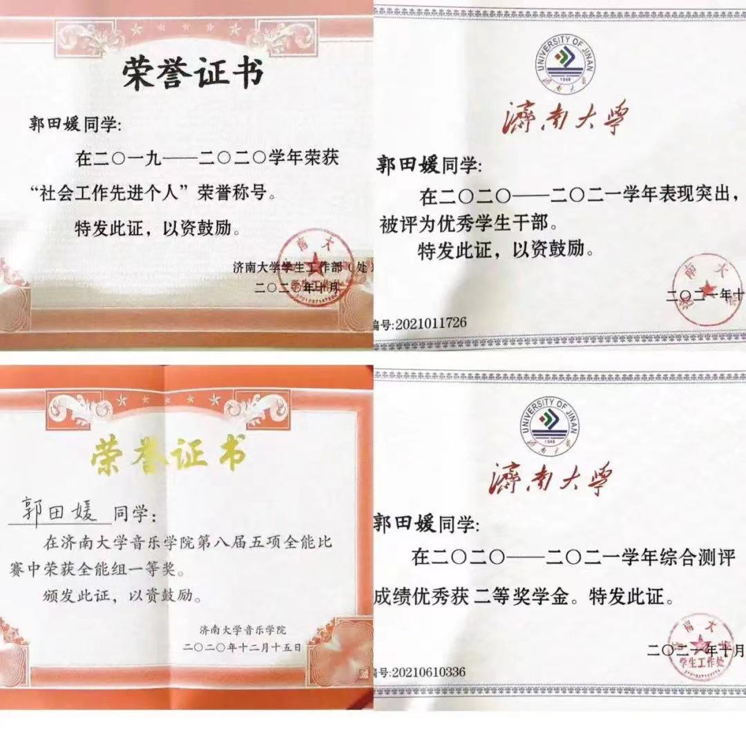 二等奖学金、优秀学生干部、五项全能综合一等奖、山东省第六届大学生艺术展演活动一等奖