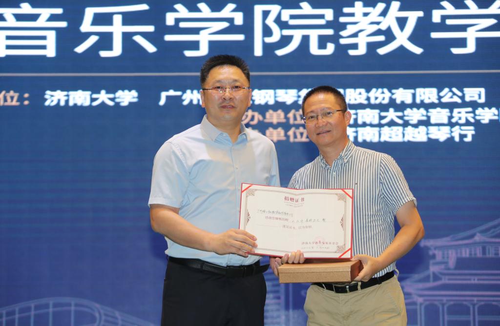 合作发展处处长、教育发展基金会办公室主任卢旺为广州珠江钢琴集团股份有限公司颁授捐赠证书和纪念品。91视频