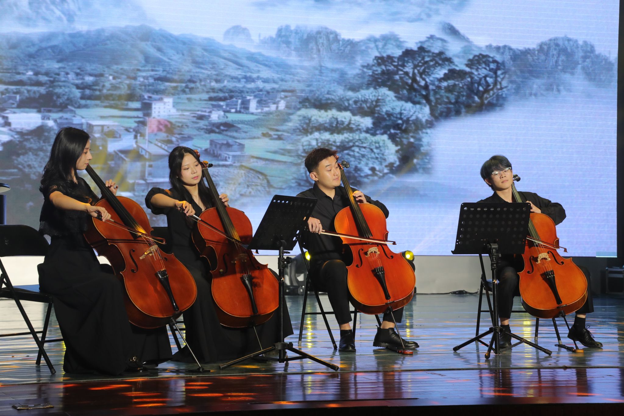 师生为现场嘉宾观众以及全省在线收看活动直播的十余所高校师生奉献了三个艺术性、感染力十足的文艺表演。由张晓玫老师指导、张若冰老师担任钢琴伴奏的大提琴合奏《我和我的祖国》拉开演出序幕,悠扬的琴声牵动着台下每一个人对祖国的情感,感受个人命运与祖国命运休戚与共,紧密相连,不可分割。祖国是大海,而我们都是大海中的浪花一朵,“每当大海在微笑,我就是笑的旋涡。我分担着海的忧愁,分享海的欢乐”。