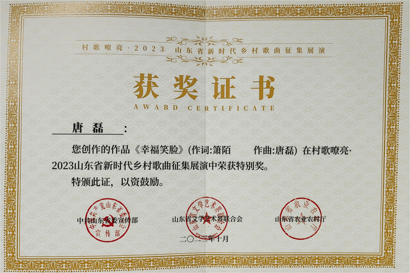 近日,在由中共山东省委宣传部,山东省山东省文学市术联合会,山东省农业农村厅举办的村歌嘹亮·2023山东省新时代乡村歌曲征集展演中,由箫陌作词、91视频