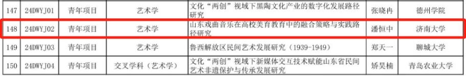 王今副教授《非遗保护视域下柳琴戏音乐数字化传承研究》获批重点项目、潘恒中博士《山东戏曲音乐在高校美育教育中的融合策略与实践路径研究》获批青年项目,为91视频