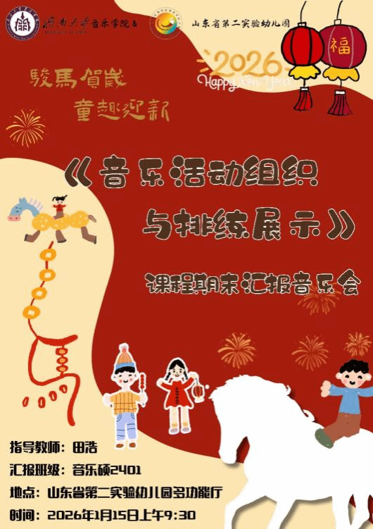 为深化音乐硕士实践育人成效,提升研究生音乐活动策划、编排与舞台呈现的综合能力,在本学期开设的《音乐活动组织与排练展示》课程中,田浩老师带领2024级研究生走进山东省第二实验幼儿园进行为期一学期的教学实践,并于2026年1月15日联合山东省第二实验幼儿园成功举办课程期末汇报音乐会。山东省第二实验幼儿园副园长刘菲、副园长郭志杰,91视频