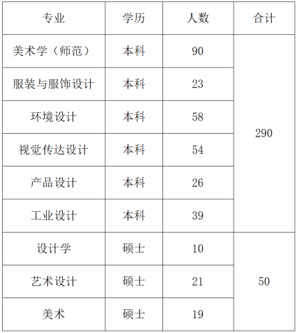 美术与设计学院始建于1987年。三十余年的办学历程中,学院始终立足社会需求和时代前沿,目前学院设6个本科教育招生专业:美术学(师范)、工业设计、视觉传达设计、环境设计、服装与服饰设计、产品设计,拥有2个硕士学位授权点:设计学一级学科硕士学位(学术型)授予点和艺术硕士(MFA)专业学位授权点(含美术和艺术设计两个领域)。学院2025届本科毕业生290人、硕士毕业生50人。信息如下: