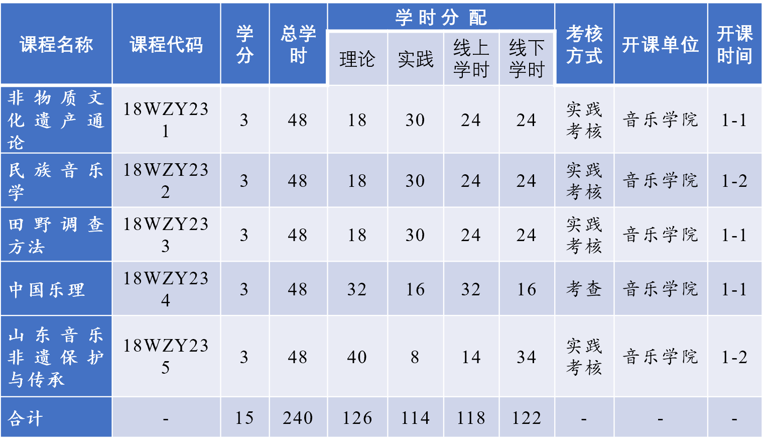 “音乐非遗学”微专业由5门课程组成,每门课程3学分,共计15学分。