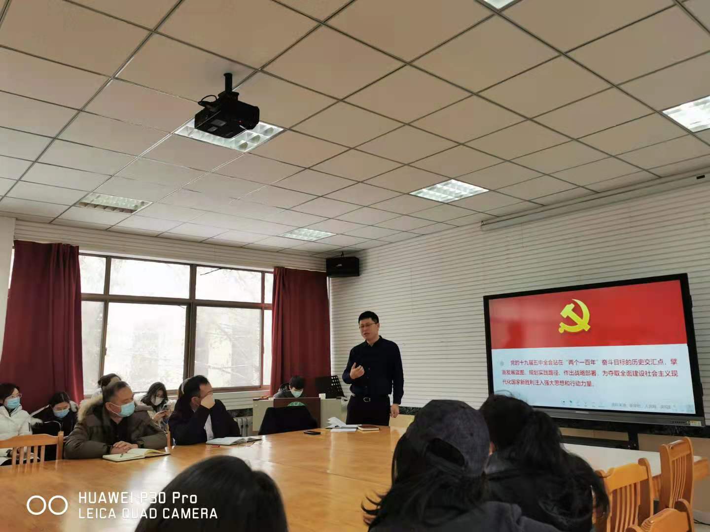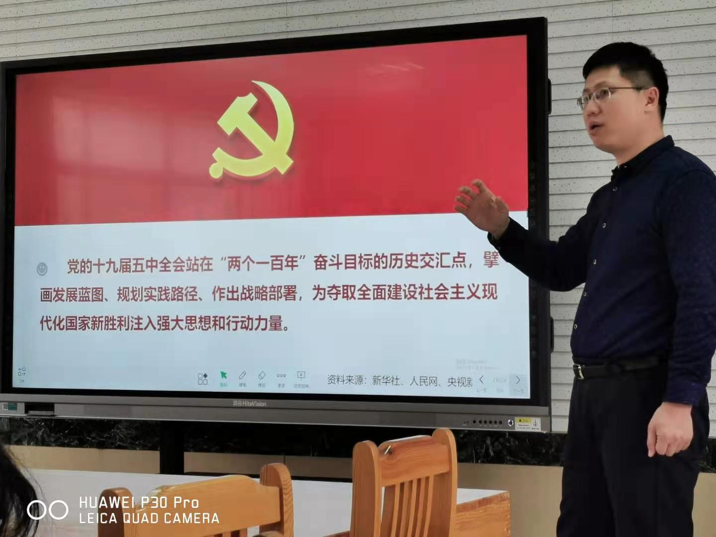 在研讨课教室召开全体教职工大会,学院党委书记刘振为全院教师做十九届五中全会精神专题宣讲。