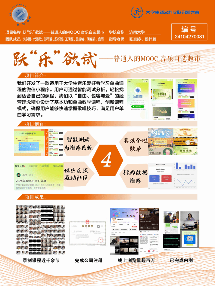 跃“乐”欲试——普通人的MOOC音乐自选超市项目基于信息碎片化时代民众追求高效率活动的背景,在前期市场调研阶段时我们发现市场中存在单曲学习需求,并且绝大多数大学生音乐爱好者想拥有个性化程度高、灵活性强、富有人文关怀的音乐课程。基于调研结果,项目开发了一款微信小程序,为大学生音乐爱好者提供多元单曲课程以供使用学习。课程组成员创新式设计全新教学法,小程序内嵌智能水平评估与推荐系统、情感交流互动版块,为用户形成专属自己的个性化音乐世界。